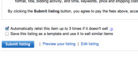 I noticed something new while listing the last few days. A while back eBay added an option to automatically relist something 3 times when the item ends. It was a check box that was added right at the end of the listing before you'd hit submit. Well I think it's only been the last few days but they've changed this option so the checkbox is checked by default. So if you do not uncheck the check box your item will be automatically relisted 3 times. I know some people have their listings automatically relist anyway but I don't. I like to manually relist each item. Sometimes I change the time of day that the listing starts. Sometimes I choose not to relist the item at all. So heads up on that one. You may be getting something you don't want. Below is a screenshot of the listing form and the option I'm referring to.